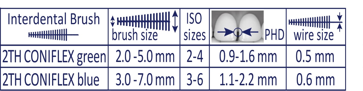 2TH Coniflex Groen 2-5mm heeft een dunne gecoate draad, bestemd voor de smallere tandtussenruimten. Voor de iets grotere tandtussenruimten kan 2TH Coniflex Blauw 3-7mm worden gebruikt.
